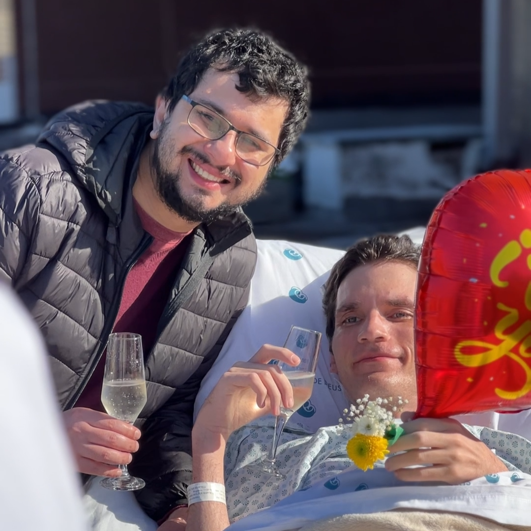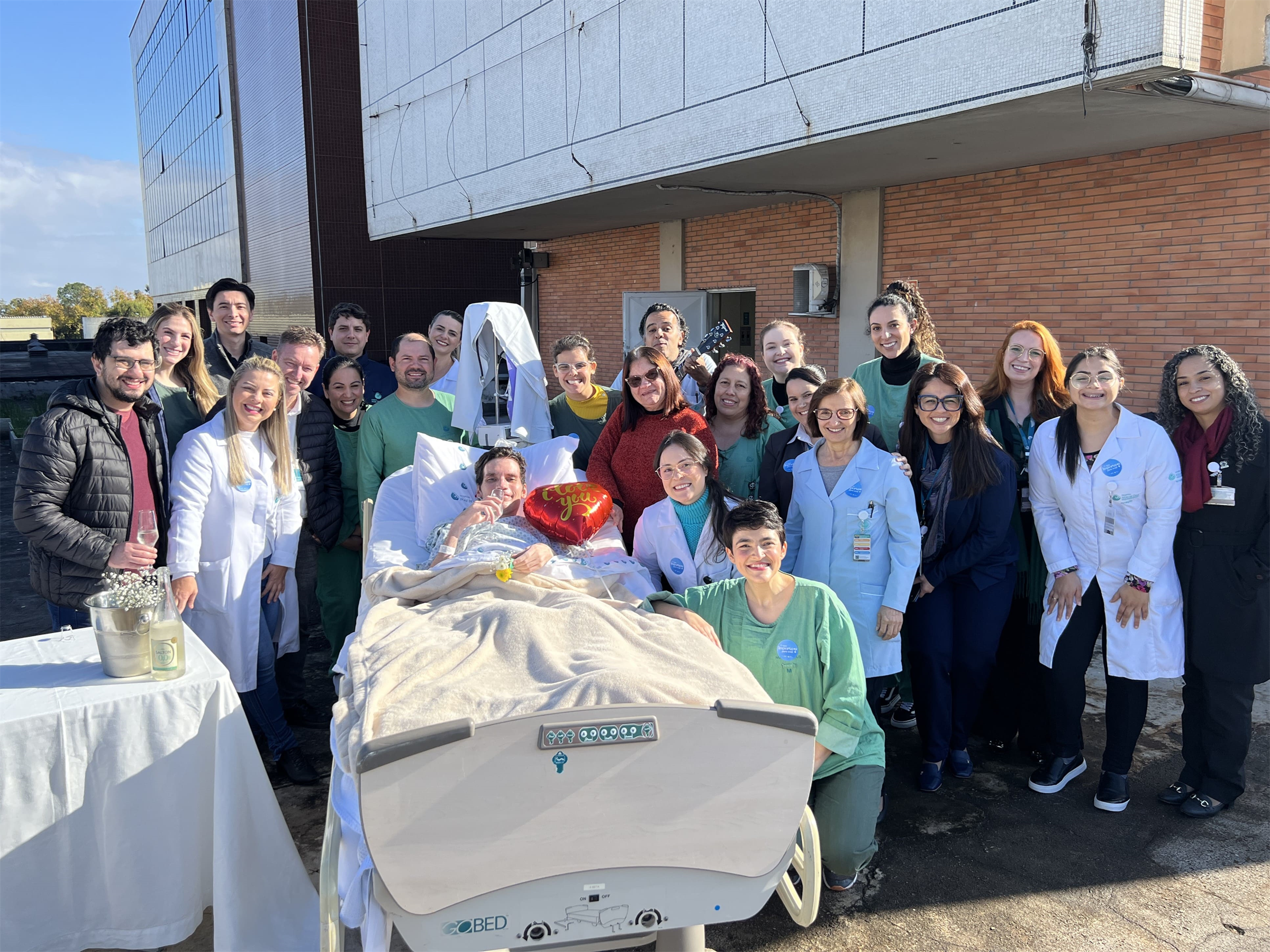 Momentos emocionantes marcaram esta sexta-feira no Mãe. Um deles foi a história do paciente Gabriel, que estava na Unidade de Terapia Intensiva há cerca de dois meses. Ele pôde aproveitar uma tarde de sol ao lado de seus familiares e de seu namorado. Com uma trilha sonora personalizada e brinde de espumante (sem álcool), foi possível trazer um pouco de alegria e conforto a esse momento difícil.