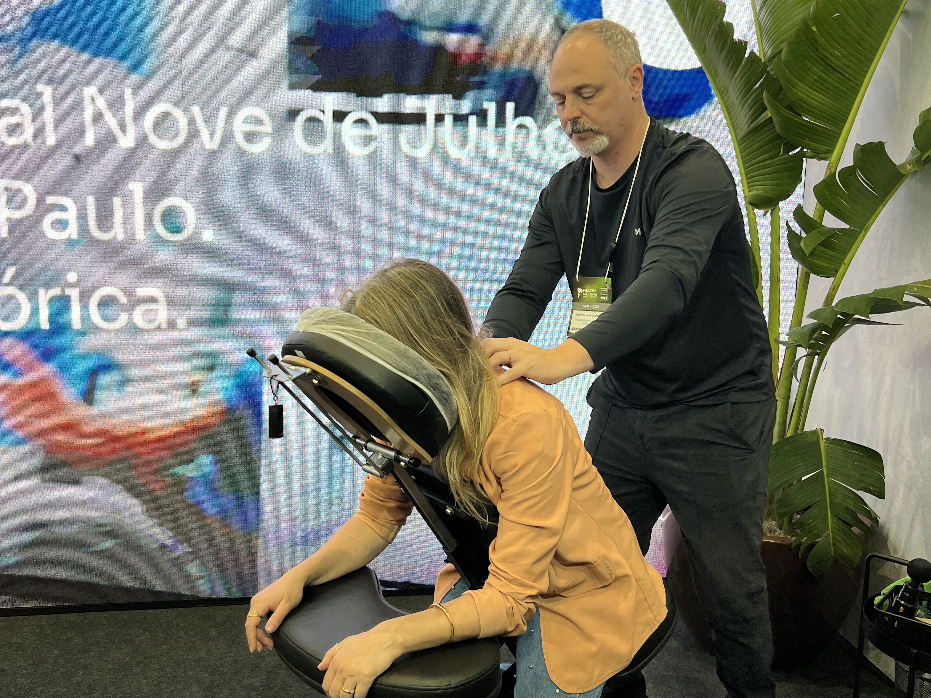 Além das trocas e encontros em nosso estande, contamos com uma equipe de massagem, que proporcionou um momento de descompressão e relaxamento aos visitantes.