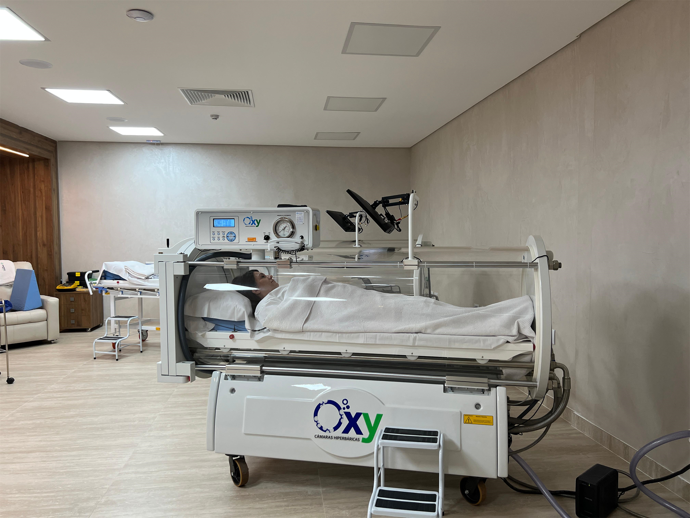 A OHB é uma modalidade terapêutica na qual o paciente respira oxigênio puro (100%), enquanto é submetido a uma pressão 2 a 3 vezes a pressão atmosférica ao nível do mar, no interior de uma câmara hiperbárica.