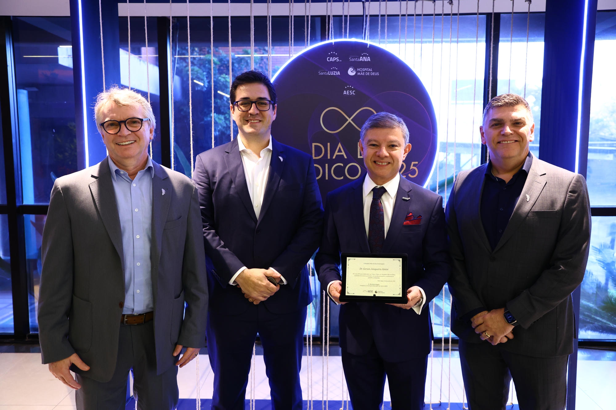 Durante a solenidade, houve falas da Diretora-Presidente da AESC, Marileda Baggio, do Diretor Executivo da AESC, João Batista Feijó, e do Diretor Executivo do Hospital Mãe de Deus, Sandro Junqueira, que representou os diretores dos Hospitais Santa Luzia e Santa Ana. Em suas mensagens, os líderes ressaltaram a importância da atuação médica e o papel essencial desses profissionais na missão de promover cuidado e acolhimento com excelência.